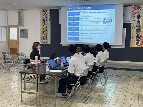 令和7年9月24日~9月26日の3日間、萩商工高校の2年生4名を受入れ、職場体験学習を行いました。 安全パトロール同行での主要現場の見学や、CADソフトを使った設計の実習を行いました。 参加した生徒たちは、建設会社がどのような工事をしているか、より深く理解できたのではないかと思います。将来は是非、建設業の仕事に就き、活躍して頂きたいです。